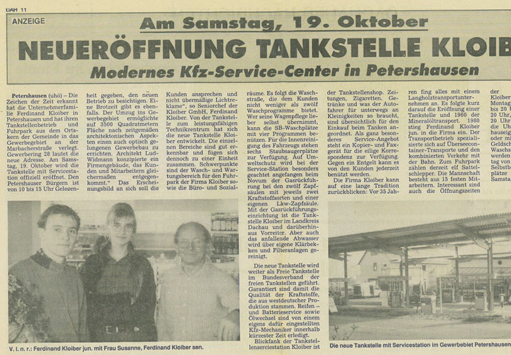 Die Kloiber Tankstelle in Petershausen ist Teil eines traditionsreichen Familienunternehmens mit langer regionaler Verbundenheit. Die Kloiber GmbH hat ihren Ursprung 1934, als Ferdinand Kloiber sen. mit einem regionalen Transportbetrieb begann. In den 1960er‑Jahren kam der Bereich Mineralöl dazu – damit auch die Tankstelle, deren Angebot sich über die Jahrzehnte weiterentwickelt hat.